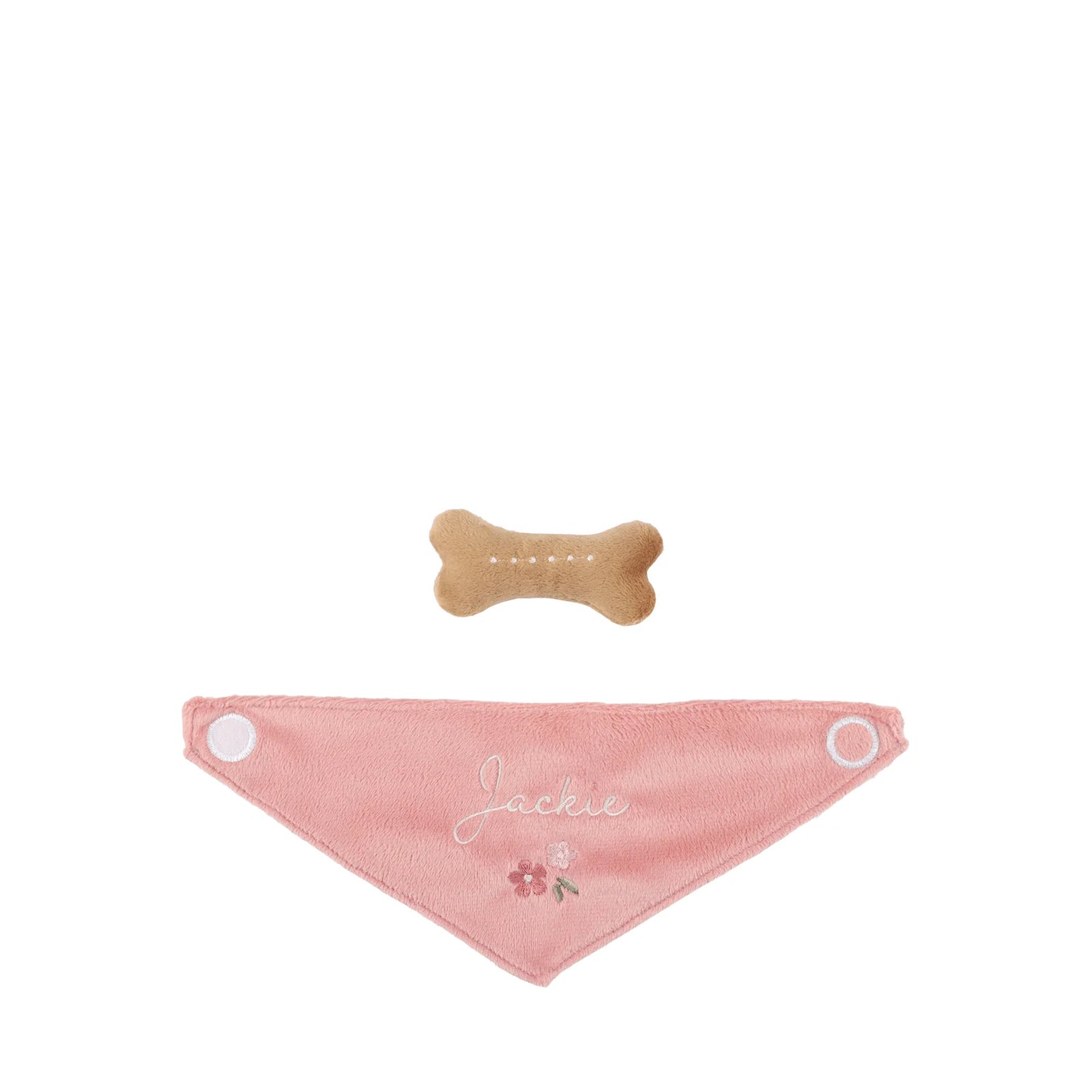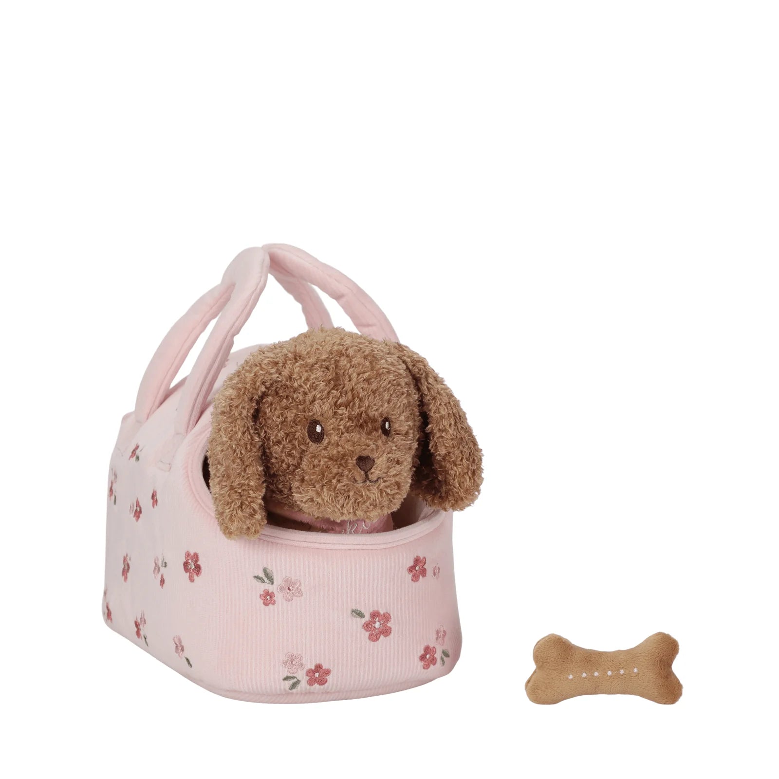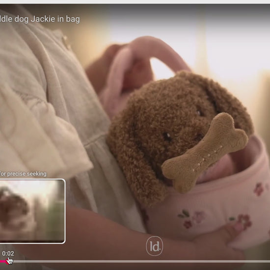 Take your faithful four-legged friend everywhere with you with this cute plush dog Jackie in a floral carrier bag! With its soft fabric and sweet face, this will quickly become your little one's favourite stuffed animal. The bag has a convenient opening at the front, so the dog's head can curiously look outside. The set also includes a plush bone to play with. A dream for every little animal lover!