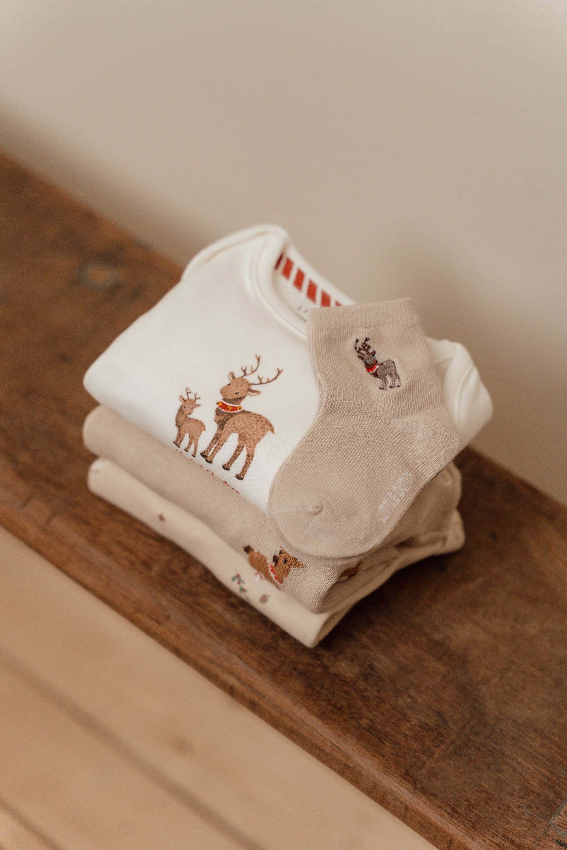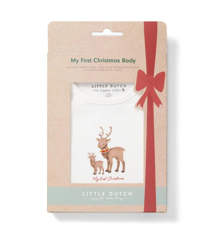 Your very first Christmas with your little one! A wonderful new world of sights, sounds and experiences filled with holiday cheer. This cute Little Dutch bodysuit will keep them warm during the winter season. Layer with a cardigan or jacket and they are ready to celebrate Christmas. A perfect unisex look for your newborn’s first Christmas. The comfortable bodysuit is made from certified organic cotton and features long sleeves and a snap button crotch. Pair with these adorable Christmas socks for the complete look!